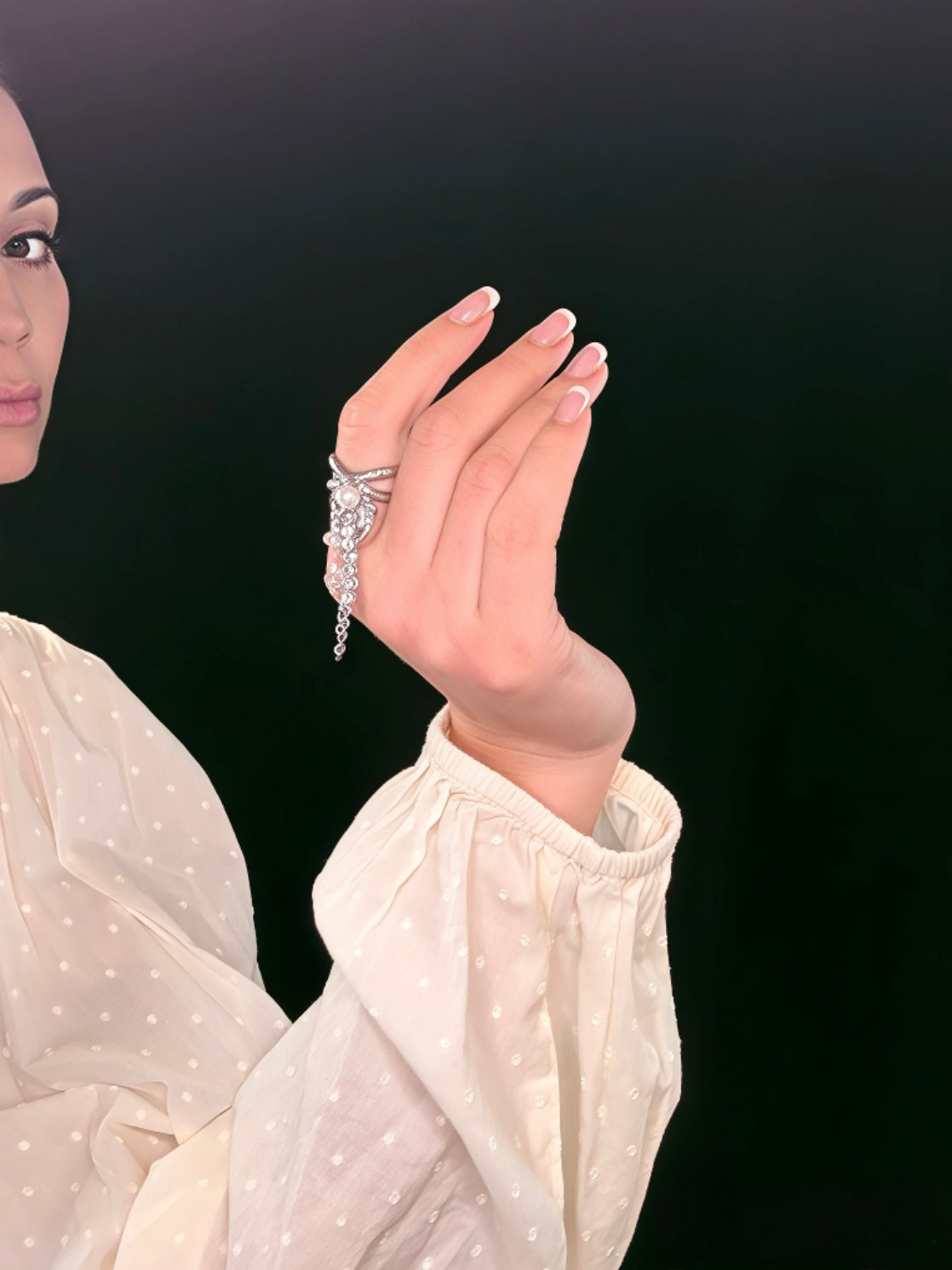 Before Midnight Ring is a silver-tone ring with soft curves, delicate chains, and tiny charms that catch the light as you move. The pearl-like bead and twisted accents add a vintage feel — like a keepsake from someone you once knew.