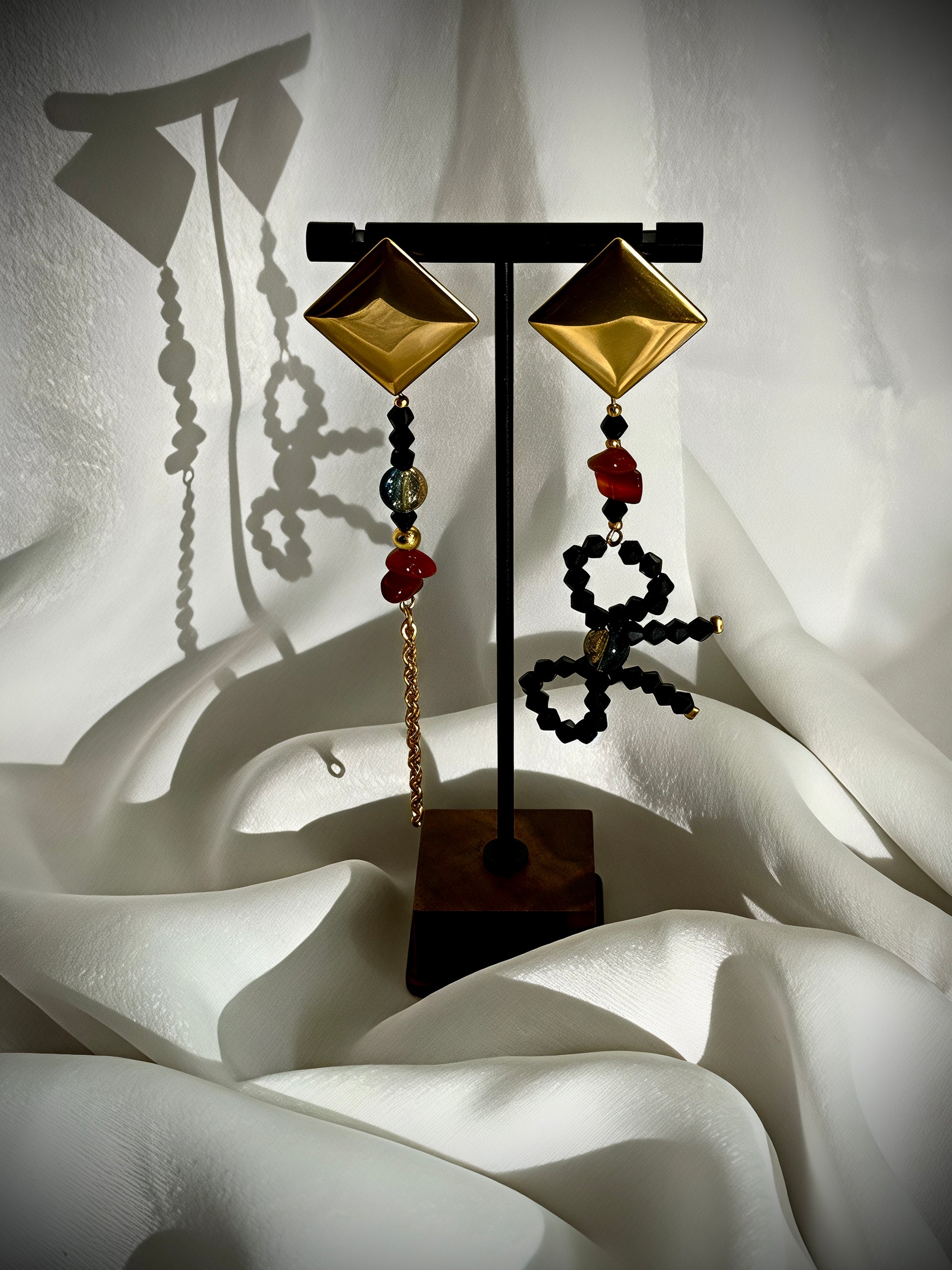 Dramatic and mischievous, Dark Whim Earrings earrings play with contrast and character. One earring features a bold bow motif, the other — a cascade of golden chains. Together they tell a story of balance between rebellion and elegance. Carnelian chips, faceted black glass, and glimmering teal beads bring in depth, texture, and a flash of light with every movement.