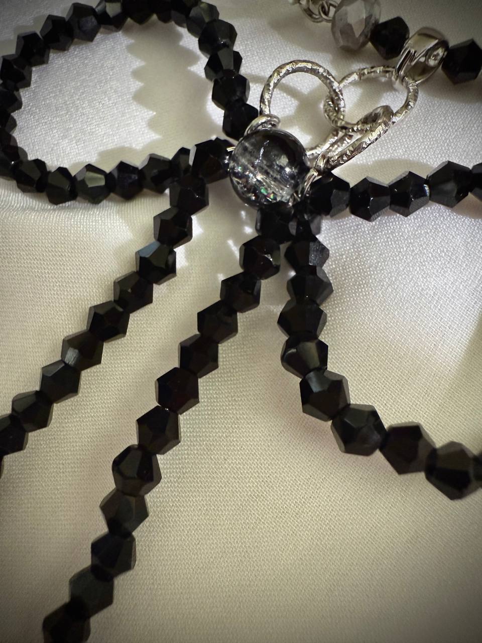 Looped In Necklace combines textured silver-tone rings, a hypoallergenic chain, and a signature hand-beaded bow made from glass crystals — a playful accent that catches the eye without trying too hard.
