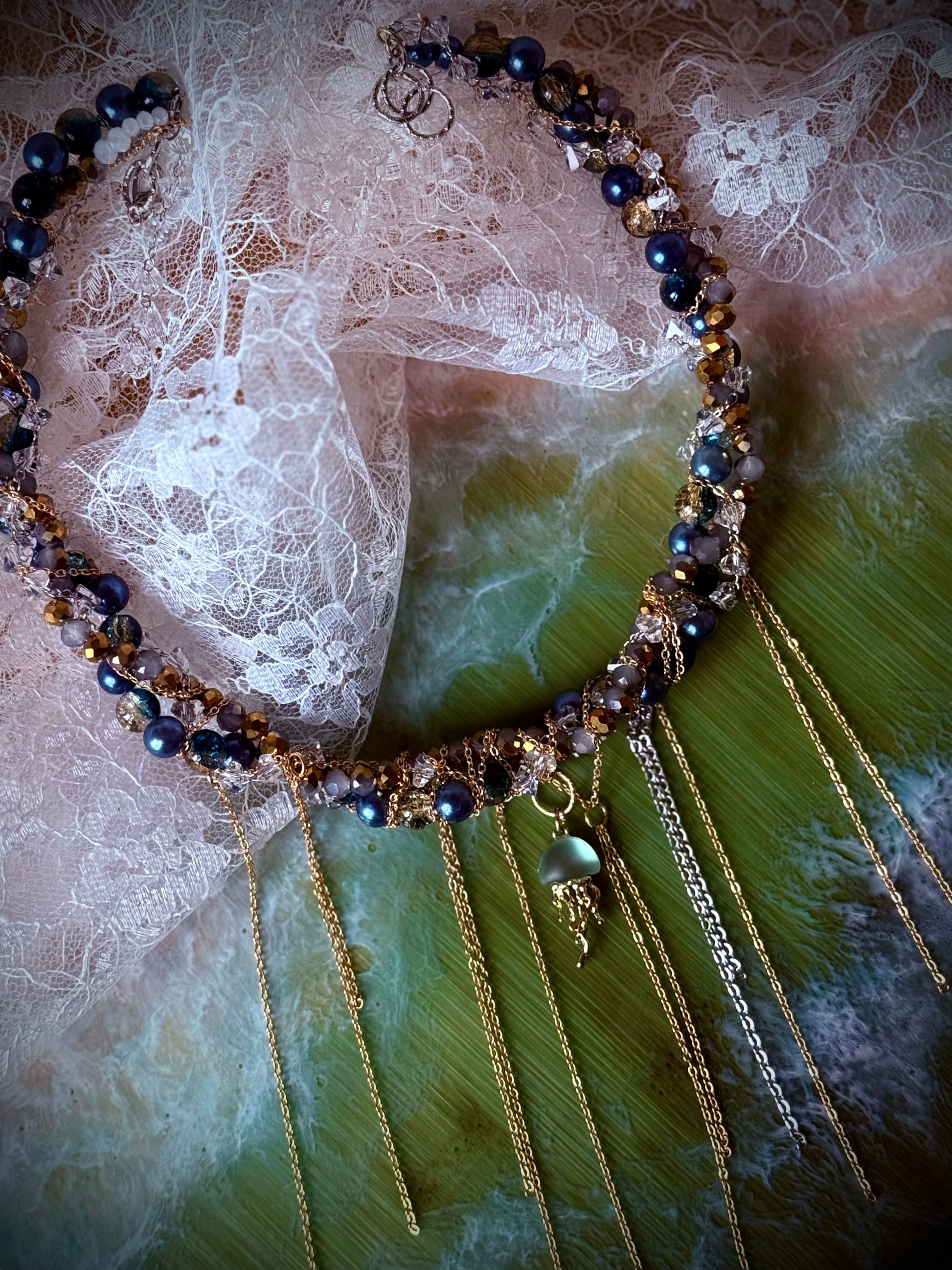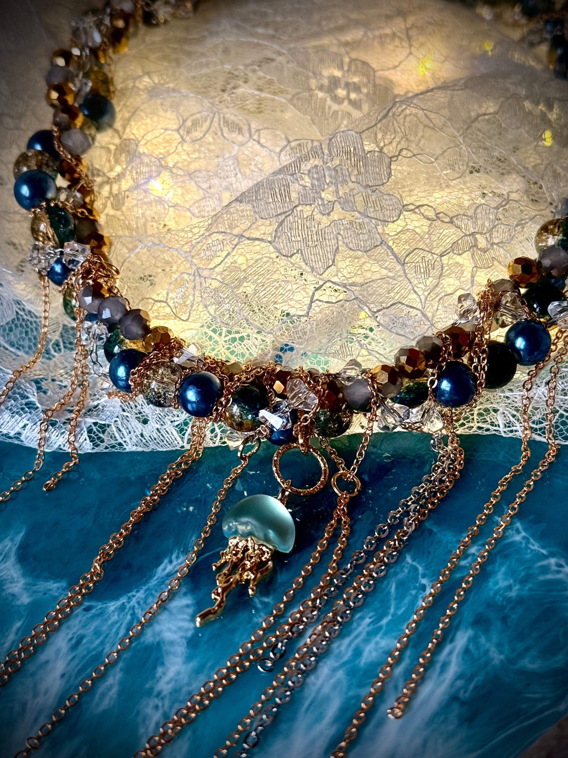 Midnight Tide Necklace is a bold yet elegant necklace with ocean-blue beads, layered gold-tone chains, and a delicate jellyfish charm that moves as you do. It’s the kind of piece you wear when you want something different — playful but refined.