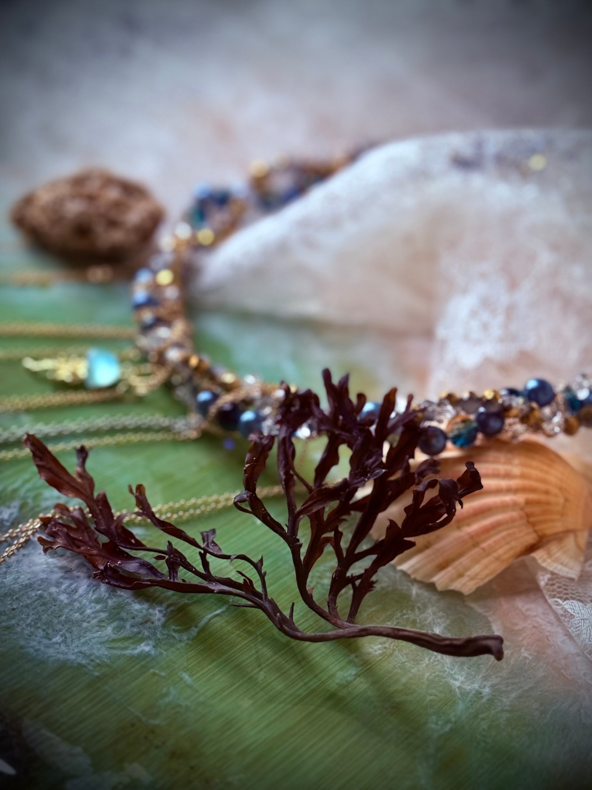 Looks beautiful with open necklines, blouses, or layered with other sea-toned pieces.