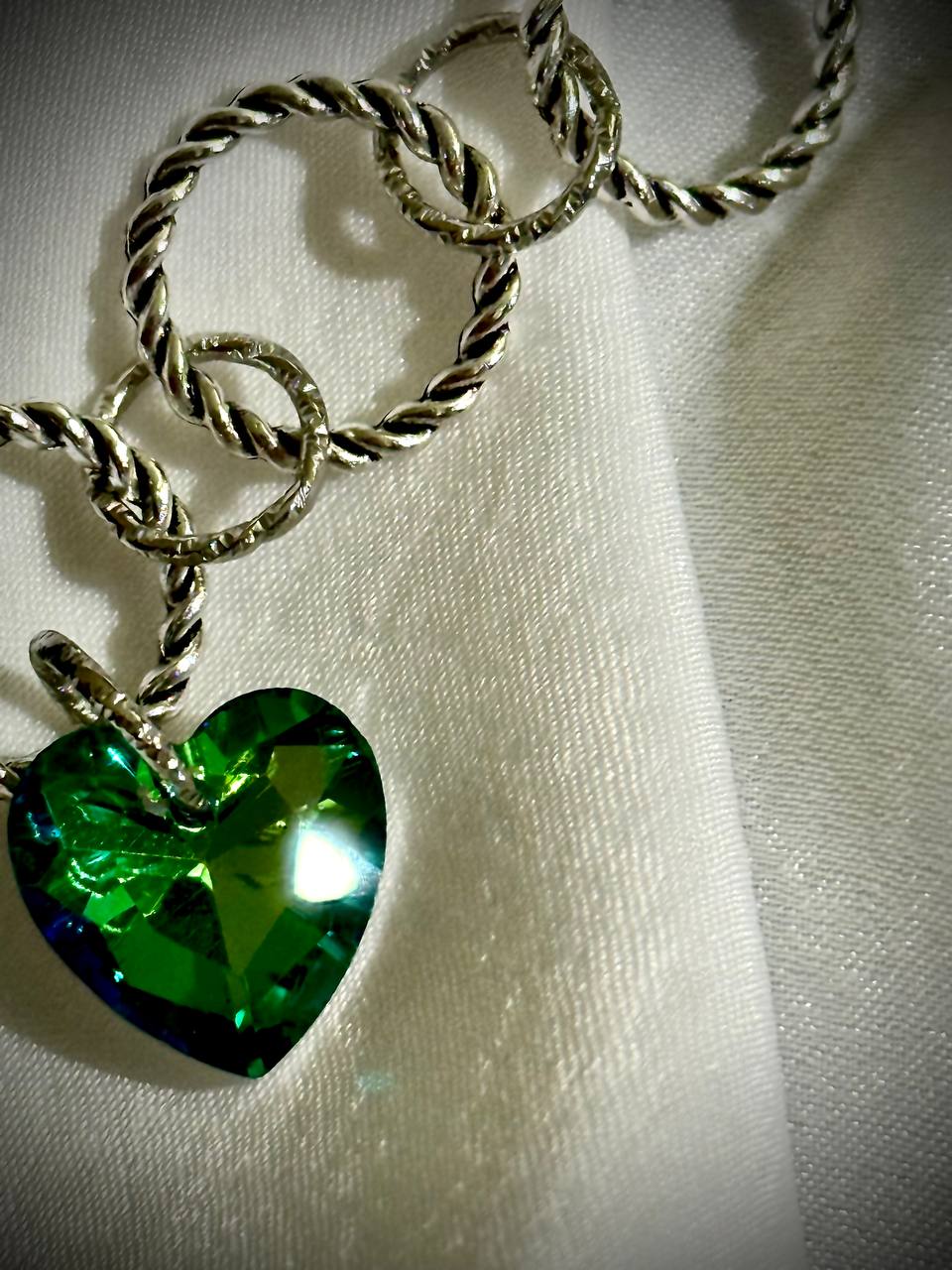A little piece to match the mood. The Fifth Letter Bracelet is made from soft black lace and finished with a green crystal heart — just like its sister choker. Light and easy to wear, it adds a subtle accent to your wrist and works beautifully on its own or as a set.